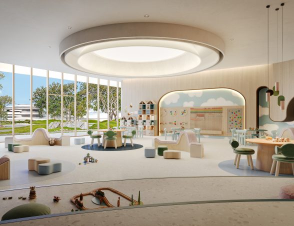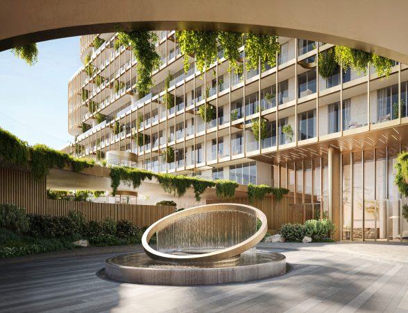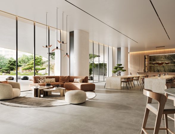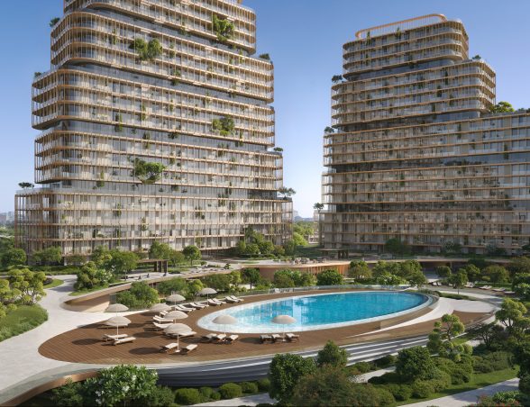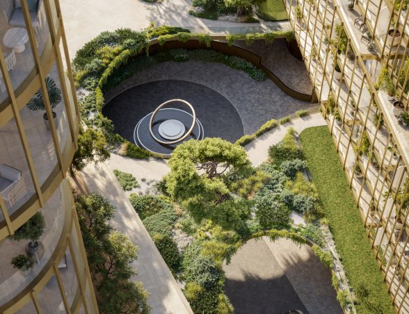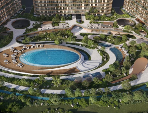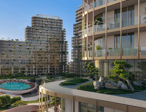 - Tri dizajnové veže prepojené zeleňou, vodnými prvkami a rozsiahlymi spoločnými zónami vytvárajú harmonické prostredie.