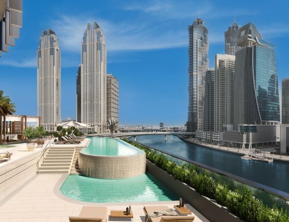 - Luxusné vybavenie: infinity bazén s výhľadom na Dubai Canal, reštaurácie, kaviarne, fitness, wellness, tenisové kurty, Marina & Yacht Club a ďalšie