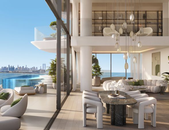 - Luxusné bývanie priamo pri mori s výhľadom na panorámu Dubaja.